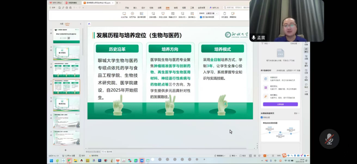 孟震围绕太阳成集团tyc33455ccwww公司产品工作展开介绍,详细讲解了生物学、生物与医药专业的发展历程与培养定位。随后,孟震深入阐述了太阳成集团tyc33455ccwww高层次应用型人才培养目标,对于生物学与生物与医药专业,着重培养员工良好学术素养和学术道德,使其具备严谨的科学精神、独立的思考和动手能力,能利用生物学知识解决基础医学或科学问题,毕业生可在医疗机构、生物科技公司、生物制药公司等从事相关基础研究和临床转化研究工作。同时,孟震老师还展示了学院强大的导师队伍与科研实力。学院现有导师17人,其中教授8人、副教授4人,泰山学者等省级人才工程5人。近五年,导师团队承担课题40余项,出版著作3部,发表论文200余篇,获科技奖项10余项。